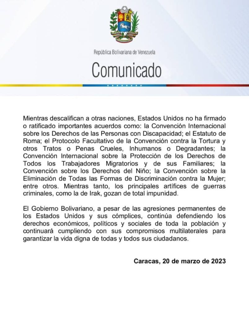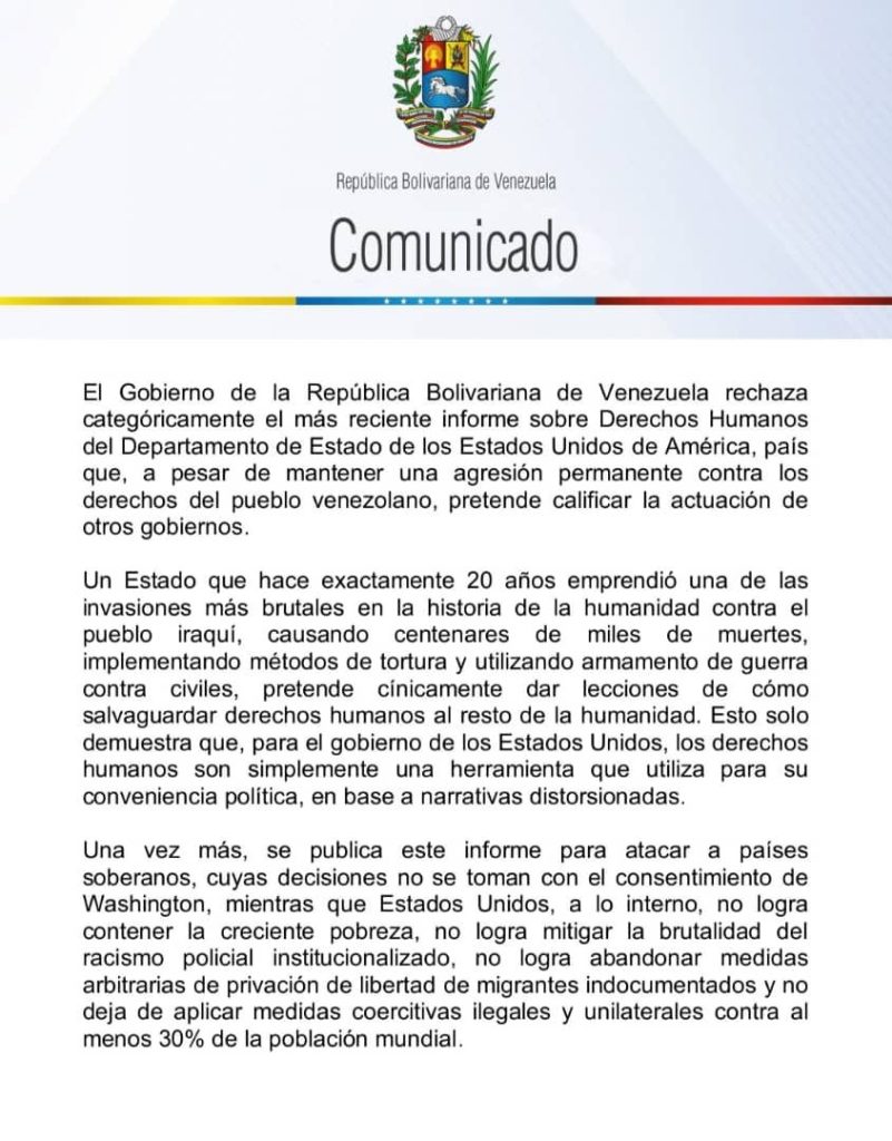 A través de un comunicado publicado en la cuenta de Twitter del canciller Yván Gil, Venezuela expreso su rechazó ante el más reciente informe sobre Derechos Humanos (DDHH) del Departamento de Estado de los Estados Unidos (EE. UU.).