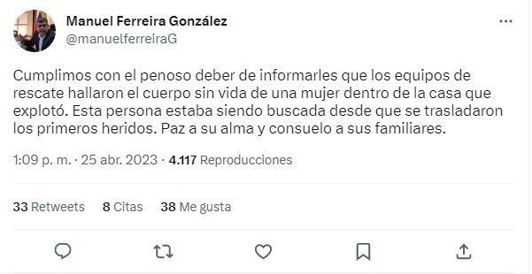 Mediante un tweet, el alcalde de la jurisdicción Manuel Ferreira González, informó que fueron reportados cuatro heridos y una mujer fallecida.