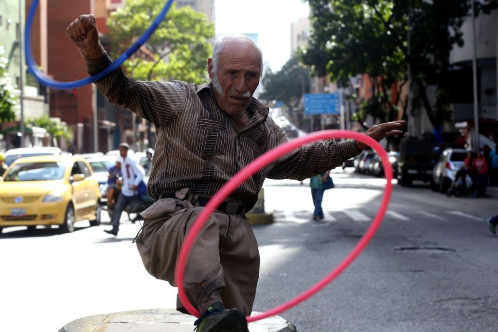 José Bestilleiro, conocido como el señor del hula hula en La Candelaria, salió como siempre a mover el esqueleto y a ganarse su dinerito entreteniendo a los que transitan por esa zona tan populosa de Caracas.