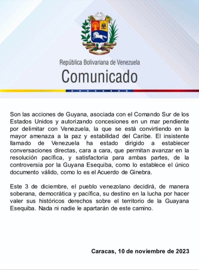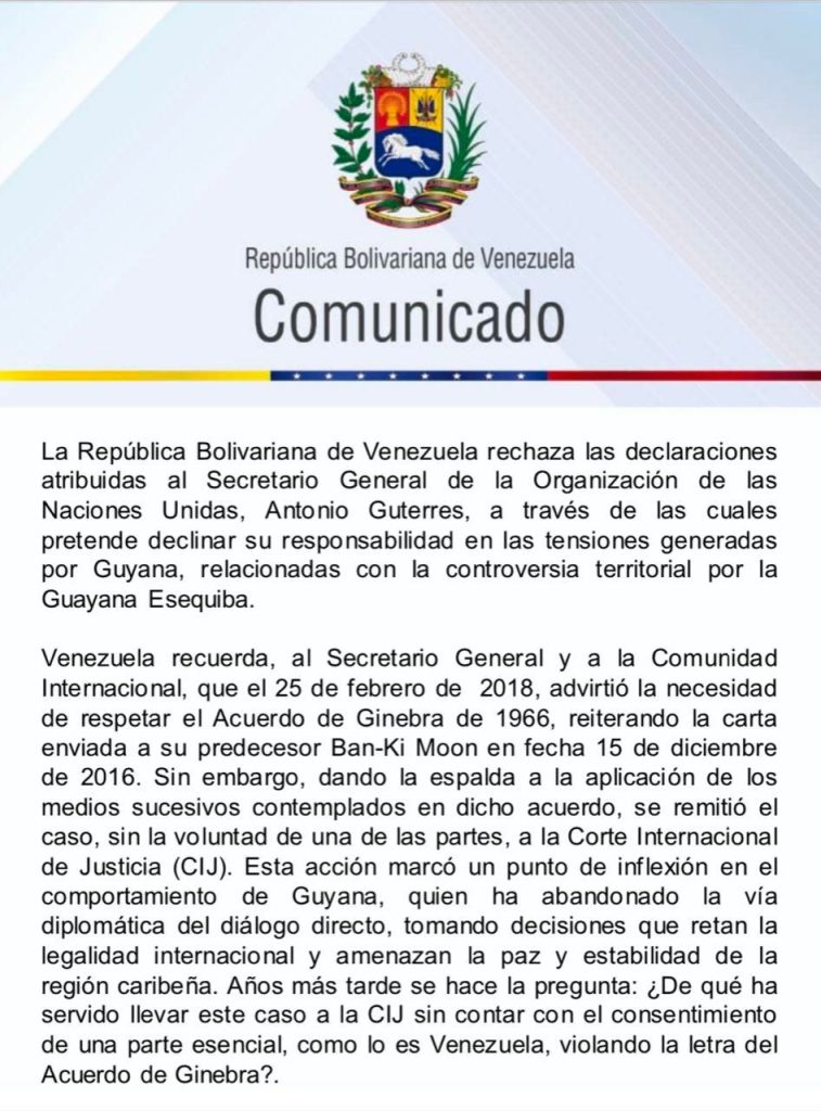 El canciller de Venezuela, Yván Gil, publicó este viernes en X un comunicado, mediante el cual la República Bolivariana rechaza las declaraciones atribuidas al secretario general de la Organización de las Naciones Unidas (ONU), António Guterres, a través de las cuales pretende declinar su responsabilidad en las tensiones generadas por Guyana, relacionadas con la controversia territorial por la Guayana Esequiba.