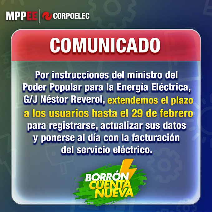 Este martes 31 de enero Corpoelec emitió un comunicado en sus redes sociales donde informó que el Plan Borrón y Cuenta Nueva se extiende hasta el 29 de febrero.