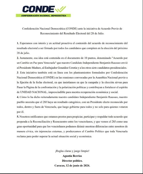 Uno de los partidos que ratifica su disposición de continuar bajo dicha línea democrática, es la Confederación Nacional Democrática (Conde) quienes mediante un comunicado, manifestaron su participación en este acto.