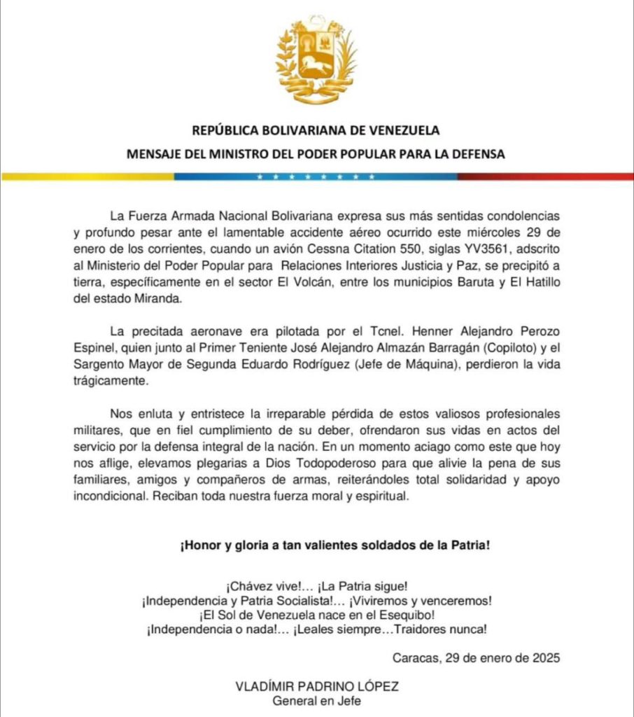 El Ministerio del Poder Popular para la Defensa y el General de la Defensa, Vladímir Padrino López, emitieron un comunicado oficial motivado al accidente aéreo ocurrido este miércoles 29 de enero entre los municipios Baruta y el Hatillo del estado Miranda.
