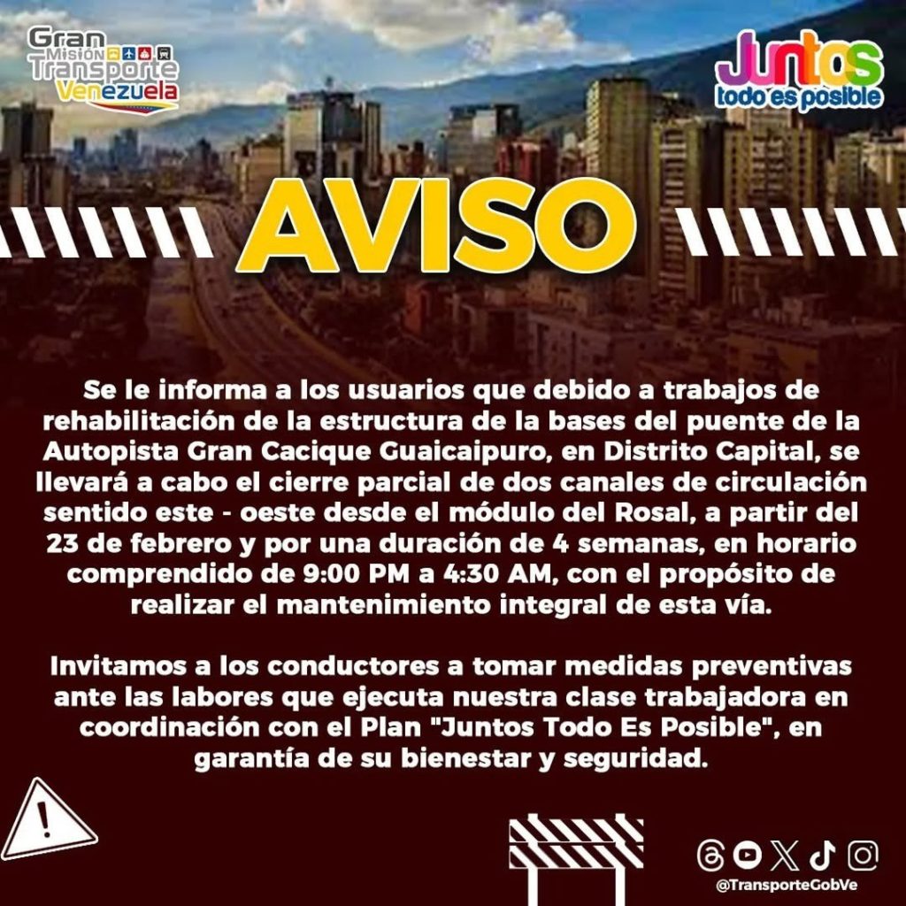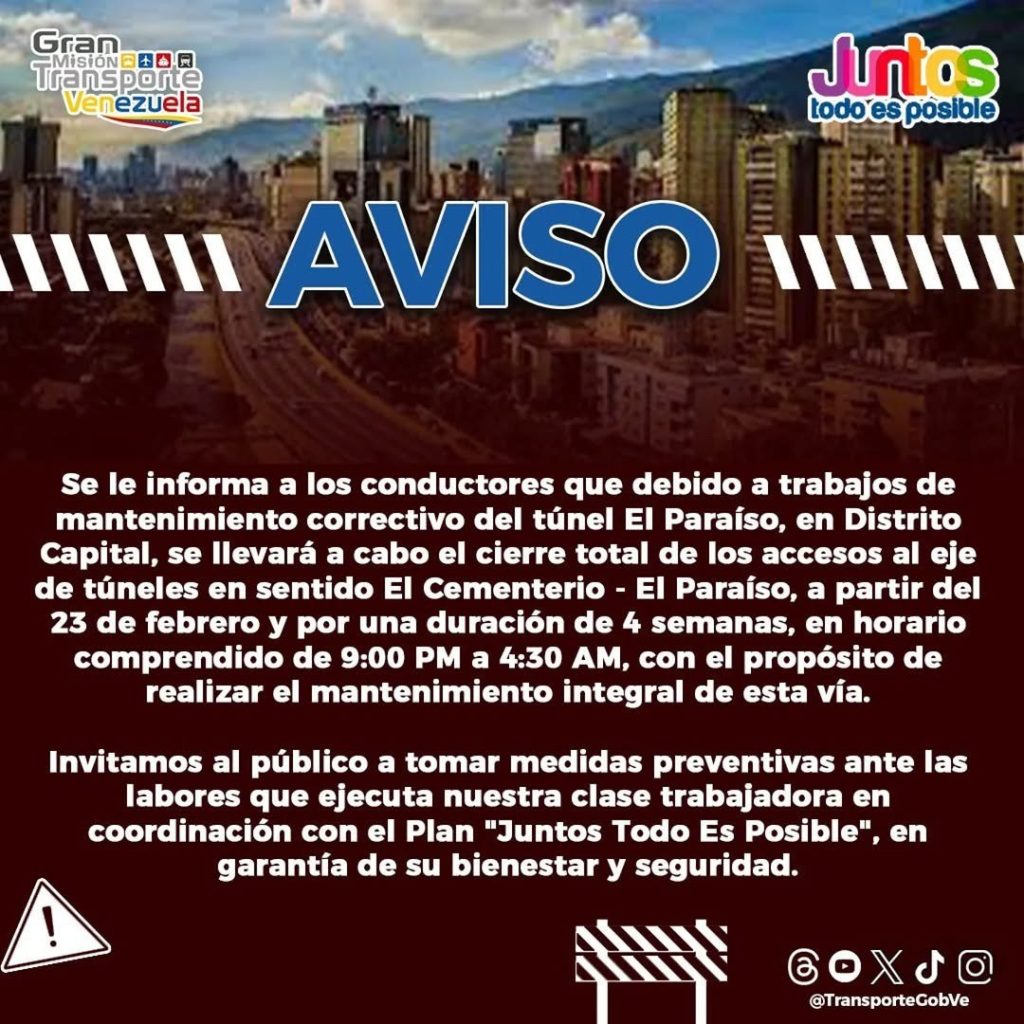 El Ministerio del Transporte informa que a partir del #23Feb y durante 4 semanas, se realizarán cierres nocturnos (sentido este-oeste desde El Rosal) y el cierre total de accesos al eje de túneles (sentido El Cementerio – El Paraíso) debido a trabajos de rehabilitación.