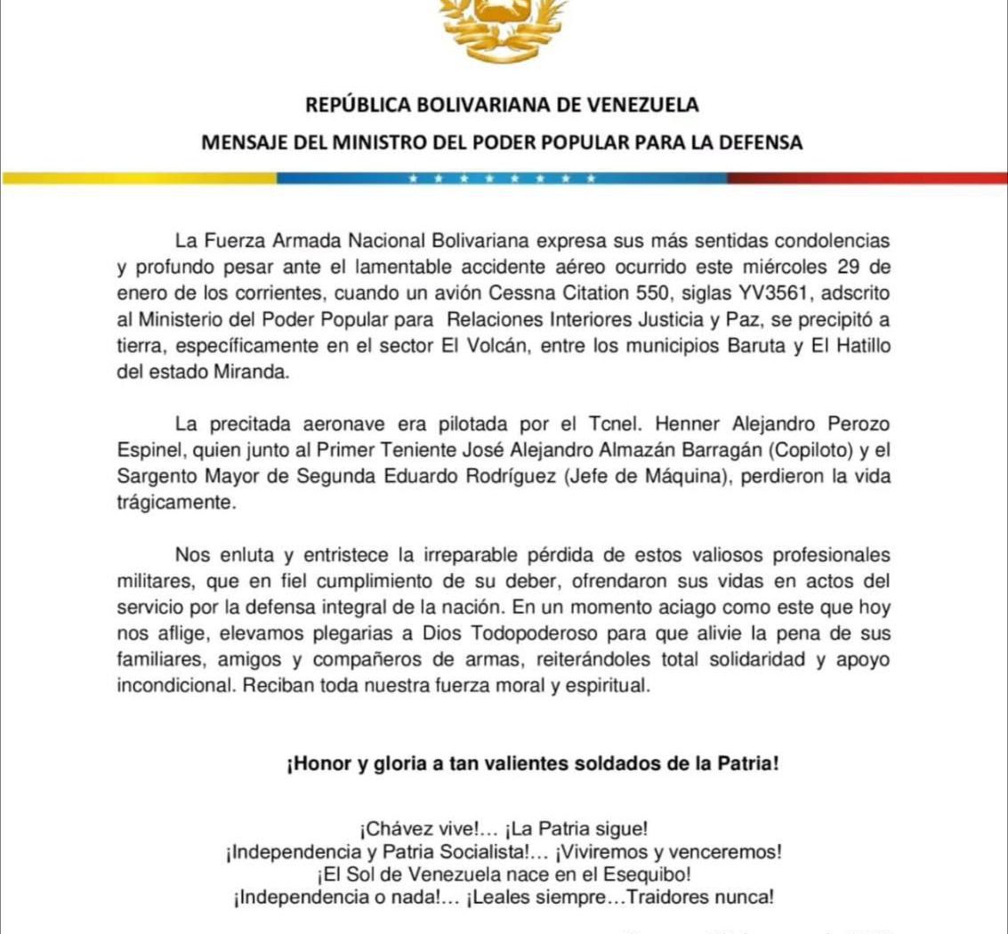 Comunicado oficial del Ministerio del Poder Popular para la Defensa por el accidente aéreo este miércoles en Baruta y Hatillo